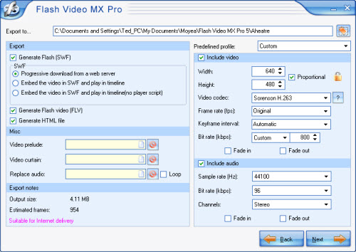 In this section, you have to options to generate a standalone FLV file; to generate an SWF file embedded with FLV; an SWF file linked with FLV, and you can specify a frame to create a thumbnail file for the FLV file, and create an HTML page embedded with SWF file for online publishing.